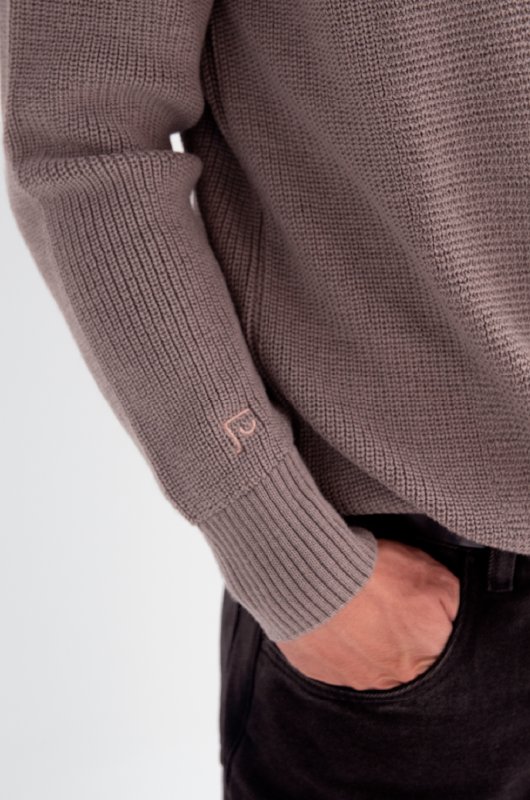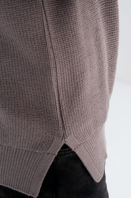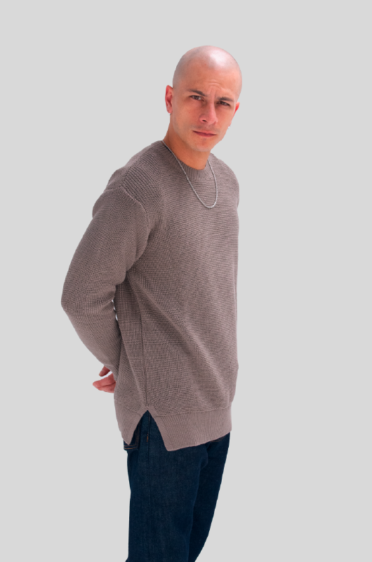 Saco cuello redondo, tejido grueso con diseño de puntada en mezcla de hilo Merino (Lana). Bordado en manga y abertura en costados. Silueta oversize.