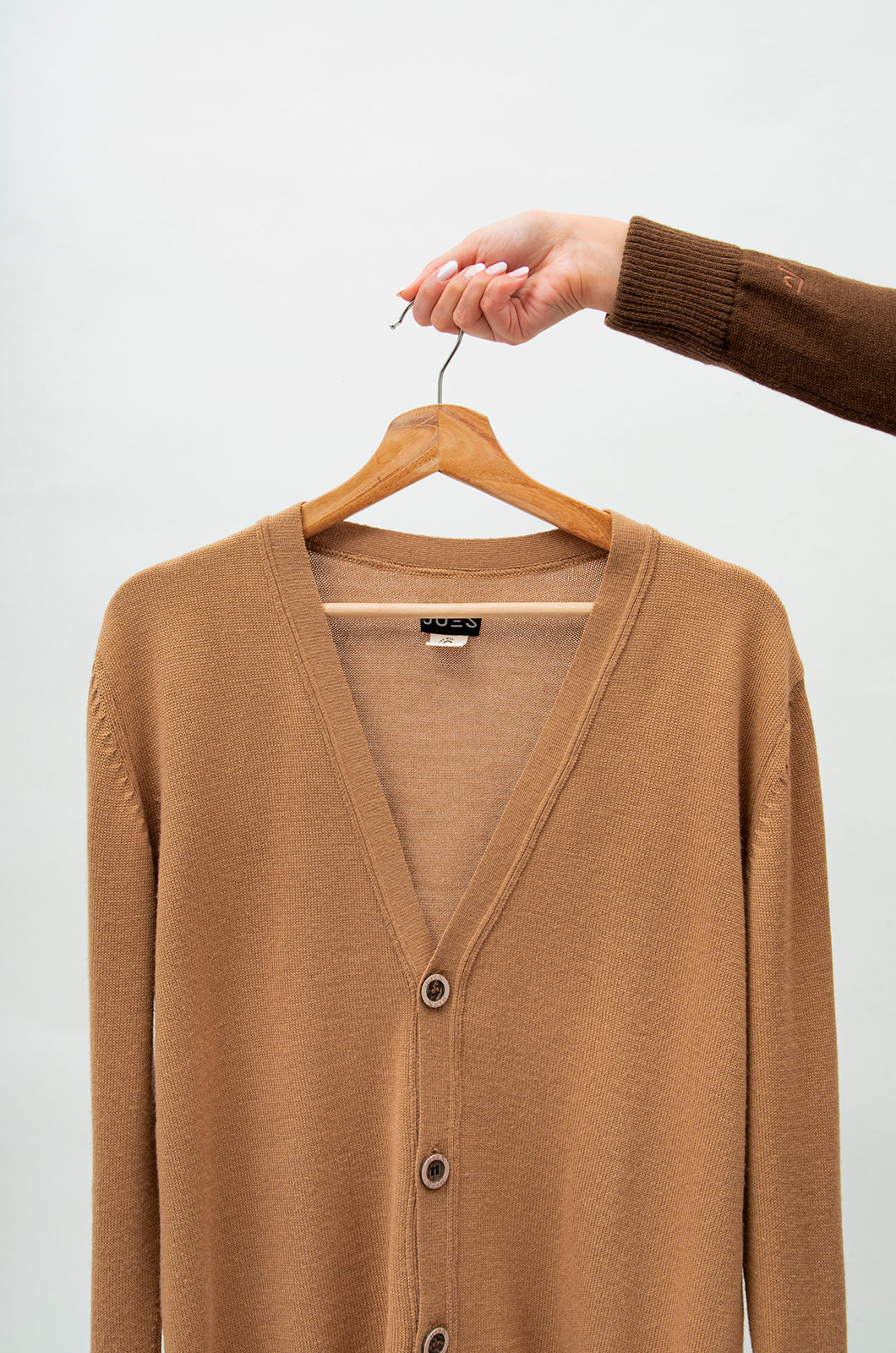 Cardigan 4 botones, tejido Jersey en mezcla de hilo Merino (Lana). Botones naturales marcados y bordado en manga.