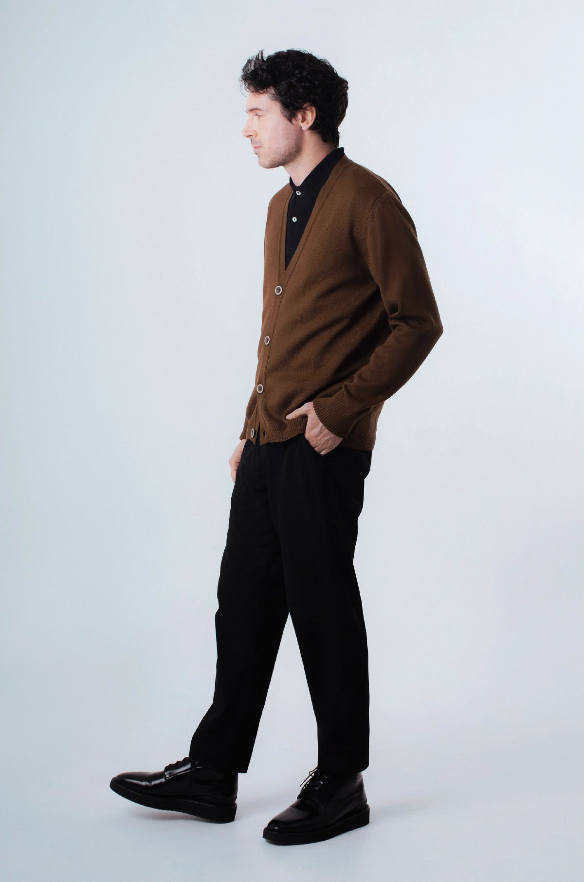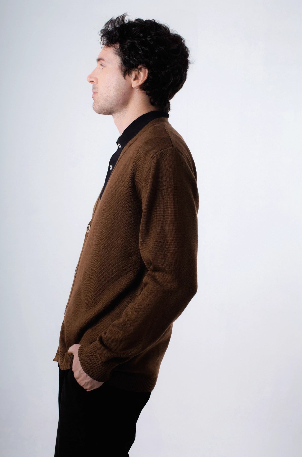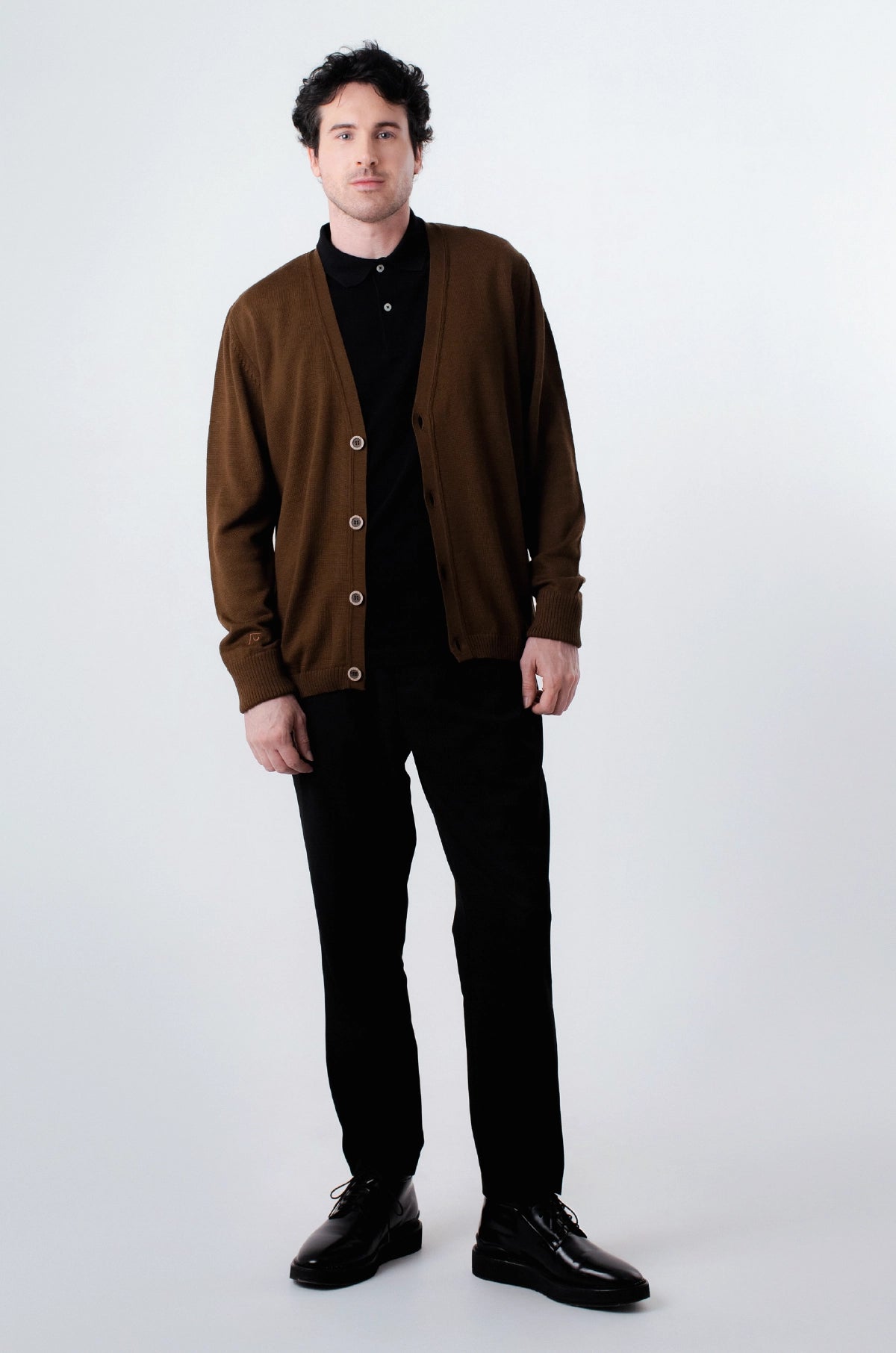 Cardigan 4 botones, tejido Jersey en mezcla de hilo Merino (Lana). Botones naturales marcados y bordado en manga.